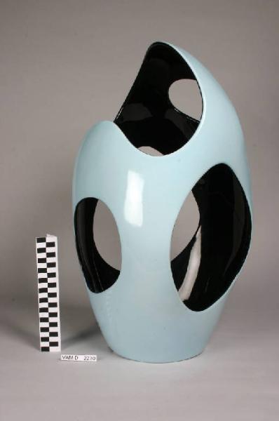 Portaombrelli a forma di uovo con grandi fori aperti nella ceramica, smaltato all'interno in smalto nero lucido e all'esterno in azzurro lucido.