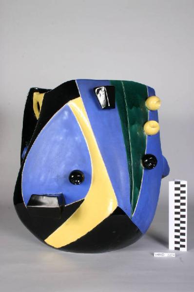 Grande vaso di forma irregolare con superficie discontinua arricchita con l'applicazione di piccole sfere e prismi; decorazione con smalti di diversi colori (blu, nero, giallo, verde) applicati sotto e soprasmalto.