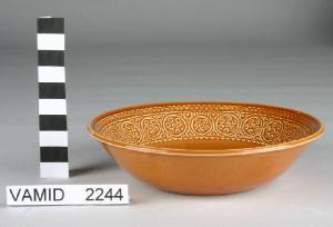 Ciotola portadolci con alto bordo esterno decorato con motivi decorativi geometrici e vegetali a rilievo; fondo color giallo aranciato.