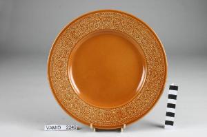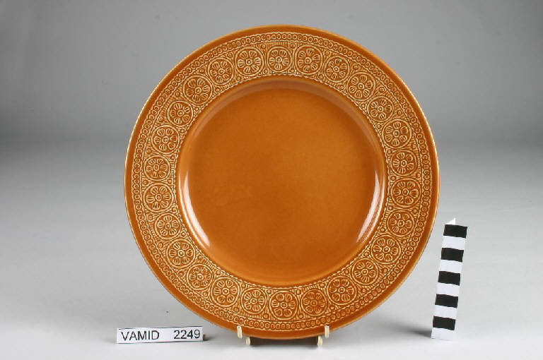 Piatto piano circolare fondo color giallo aranciato; motivi decorativi geometrici e vegetali a rilievo lungo la tesa.