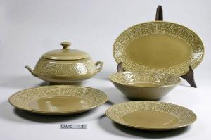 Servizio da tavola interamente smaltato in verde scuro con tesa decorata a rilievo con fiorellini e motivi geometrici, composto da una zuppiera con coperchio, un'insalatiera, un piatto da portata tondo, un piatto da portata ovale, un piatto piano.