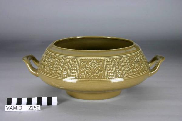 Zuppiera interamente smaltata in verde scuro con alta fascia esterna decorata a rilievo, manici rettangolari e coperchio circolare con manico sommitale a fiore.