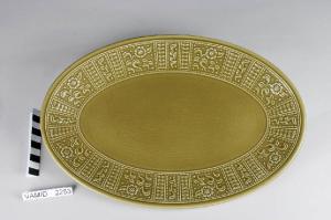 Piatto da portata ovale interamente smaltato in verde scuro con tesa decorata a rilievo.