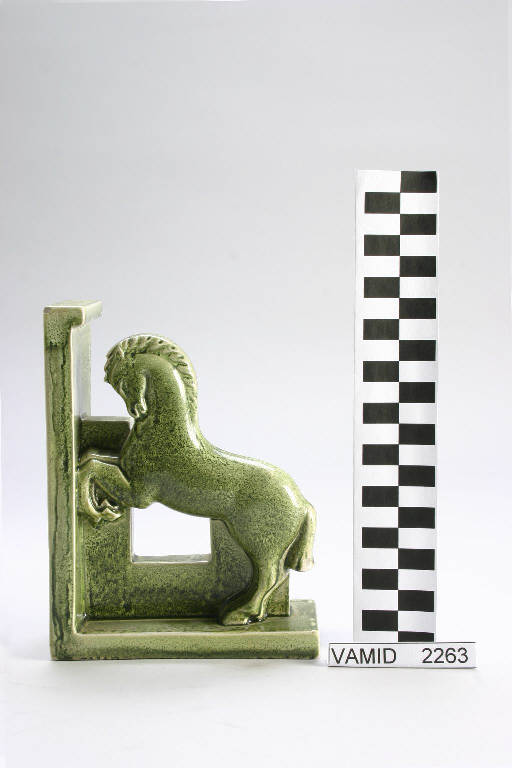 - NOTIZIE STORICO CRITICHE Il fermalibri, eseguito in serie, è decorato solo da un lato da una statuetta di cavallo impennato (stile Biancini), è smaltato in verde muschio. E' databile al 1937-1940, periodo nel quale Biancini si trasferisce a Laveno per collaborare con Guido Andlovitz alla direzione artistica. A. Reggiori e N. Sangermano propongono la datazione alla fine degli anni '40 (scheda di catalogo cartacea conservata nel Museo).