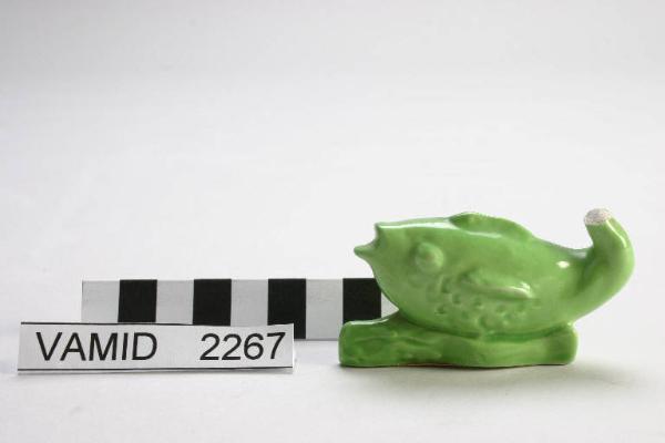 - NOTIZIE STORICO CRITICHE La sculturina, eseguita in serie in colore verde chiaro, fa parte di un gruppo di piccole opere in terraglia smaltata raffiguranti animali marini attribuibili ad Angelo Biancini. L'opera, sprovvista di marchio, databile al 1937-1940, periodo nel quale Biancini si trasferisce a Laveno per collaborare con Guido Andlovitz alla direzione artistica.