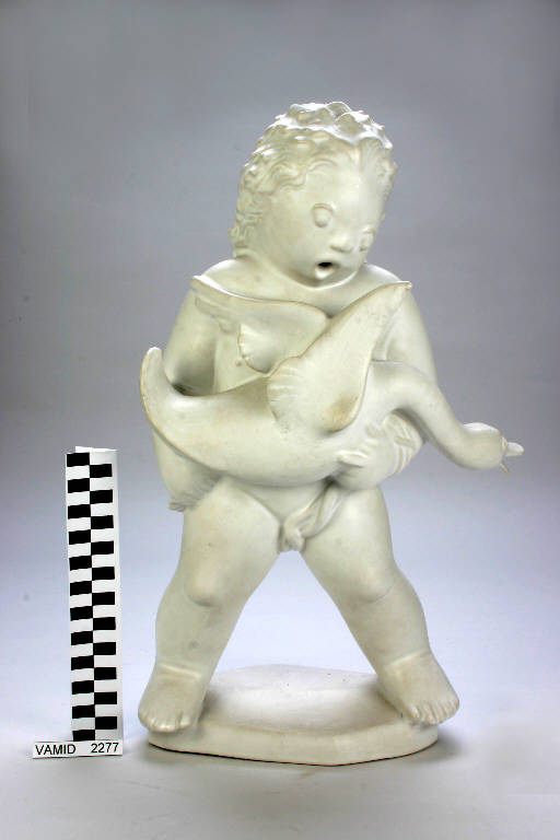 - NOTIZIE STORICO CRITICHE La statua, interamente rivestita di smalto bianco, è indicata con la denominazione "Putto con oca 1550" nel "Catalogo articoli fantasia 1955" della S. C. I. di Laveno (p. 64).