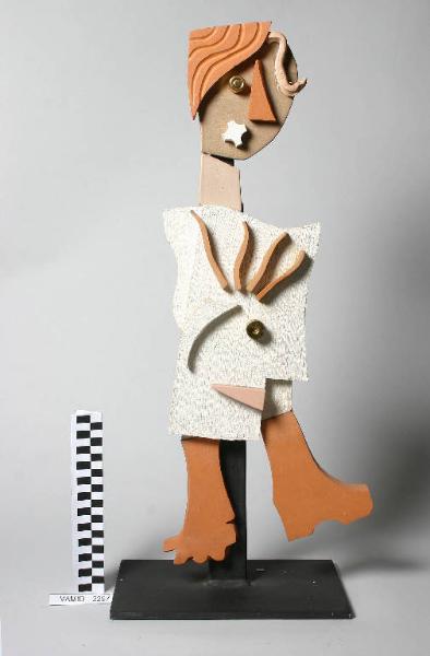 Figura composta da vari elementi assemblati e fissati a supporto di ferro con base quadrata. Smalti policromi.
