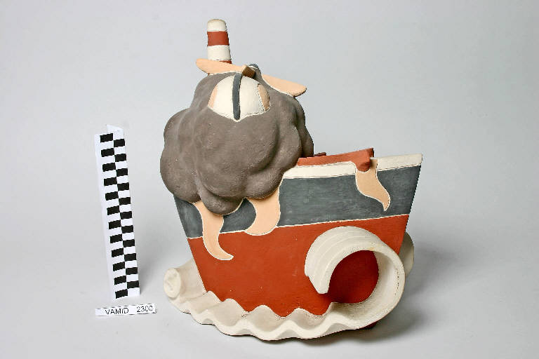 - NOTIZIE STORICO CRITICHE L'oggetto, che ricorda una piccola imbarcazione, è eseguito a mano in un unico esemplare con terre refrattarie colorate e assemblate prima della cottura a 1000° circa. Fa parte della serie "fischietti popolari in ceramica" ed è stato ceduto al museo dall'autore.