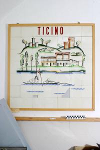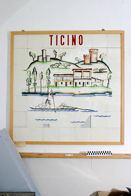 - NOTIZIE STORICO CRITICHE Il pannello in esame fa parte di un gigantesca composizione di piastrelle (in totale 23 mq. circa) realizzata nel 1938 per la Mostra dell'Autarchia in Roma, di cui fu l'evento più spettacolare. Nella composizione erano indicate in alto le materie prime e le fonti di energia con le zone di provenienza, tutte rigorosamente italiane (San Vincenzo, Gattinara, Tremenico, Ticino, Vizzola Ticino) e per ognuna Andlovitz uno dei suoi sintetici e gradevolissimi paesaggi. Più in basso sempre Andlovitz aveva illustrato le lavorazioni tecniche della terraglia, stilizzando, con più severità del solito, figure di operai e operaie. Ancora più sotto una veduta complessiva del profilo dei monti e delle fabbriche di Laveno. Secondo altre ipotesi non attendibili, il pannello sarebbe stato eseguito in occasione dell'inaugurazione a Milano della sede del giornale fascista "Il Popolo d'Italia". Esistono delle lettere di corrispondenza tra G. Andlovitz e G. Ponti, nelle quali si parla di un grande pannello da collocarsi a Milano in occasione della venuta di B. Mussolini, il pannello è diverso da quello in esame. Un'altra supposizione, anch'essa non attendibile, è che il pannello sia stato esposto a una fiera campionaria a Milano per celebrare la posa in opera del famosissimo forno tedesco Dresler nella fabbrica di Laveno (cfr. scheda cartacea 2560-2562 di Reggiori, Sarzilla). Dietro ogni piastrella ci sono segni di incollamento su muro con destrina. Le piastrelle in terraglia forte bianca a smalto lucido sono decorate a fuoco di muffola (terzo fuoco o soprasmalto) con colori molto forti come il rosso corallo (oggi non più in uso), il bruno, il blu e il verde. talune parti sono state dipinte con sfumature a pennello. Il lavoro di decorazione è sicuramente stato eseguito presso lo stabilimento Lago nel reparto di Decorazione, allora diretto da Pietro De Ambrosis. Superiormente alla presente veduta del Ticino era scritto su piastrelle "TICINO" e in basso "QUARZO".