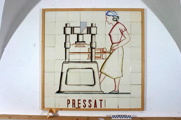 - NOTIZIE STORICO CRITICHE Il pannello in esame fa parte di un gigantesca composizione di piastrelle (in totale 23 mq. circa) realizzata nel 1938 per la Mostra dell'Autarchia in Roma, di cui fu l'evento più spettacolare. Nella composizione erano indicate in alto le materie prime e le fonti di energia con le zone di provenienza, tutte rigorosamente italiane (San Vincenzo, Gattinara, Tremenico, Ticino, Vizzola Ticino) e per ognuna Andlovitz uno dei suoi sintetici e gradevolissimi paesaggi. Più in basso sempre Andlovitz aveva illustrato le lavorazioni tecniche della terraglia, stilizzando, con più severità del solito, figure di operai e operaie. Ancora più sotto una veduta complessiva del profilo dei monti e delle fabbriche di Laveno. Secondo altre ipotesi non attendibili, il pannello sarebbe stato eseguito in occasione dell'inaugurazione a Milano della sede del giornale fascista "Il Popolo d'Italia". Esistono delle lettere di corrispondenza tra G. Andlovitz e G. Ponti, nelle quali si parla di un grande pannello da collocarsi a Milano in occasione della venuta di B. Mussolini, il pannello è diverso da quello in esame. Un'altra supposizione, anch'essa non attendibile, è che il pannello sia stato esposto a una fiera campionaria a Milano per celebrare la posa in opera del famosissimo forno tedesco Dresler nella fabbrica di Laveno (cfr. scheda cartacea 2560-2562 di Reggiori, Sarzilla). Dietro ogni piastrella ci sono segni di incollamento su muro con destrina. Le piastrelle in terraglia forte bianca a smalto lucido sono decorate a fuoco di muffola (terzo fuoco o soprasmalto) con colori molto forti come il rosso corallo (oggi non più in uso), il bruno, il blu e il verde. talune parti sono state dipinte con sfumature a pennello. Il lavoro di decorazione è sicuramente stato eseguito presso lo stabilimento Lago nel reparto di Decorazione, allora diretto da Pietro De Ambrosis. Inferiormente alla presente rappresentazione compariva sulle piastrelle la scritta "PRESSATURA": si trattava dello stampaggio ceramico di cui Laveno vantava da anni la tecnologia della pezzeria (anche in porcellana).