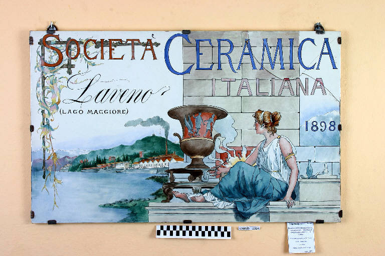 - NOTIZIE STORICO CRITICHE La grande targa è dipinta a mano sottosmalto: sullo sfondo si scorge la fabbrica della S. C. I. di Laveno con la fornace originaria. Fu eseguita (probabilmente da Federico Paglia) per l'Esposizione di Torino del 1898. Il Museo di Laveno possiede un altro esemplare di questo riquadro, con cornice in bambù, di proprietà comunale.
