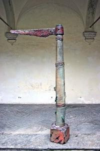 La scultura è composta da tre elementi cilindrici in argilla che si incastrano uno nell'altro a formare il tronco verticale e da una lama in ferro dipinto innestata in alto a bandiera