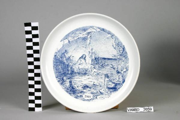 Piatto privo di tesa con largo cavetto. Sul fondo scena figurativa circolare in colore blu.
