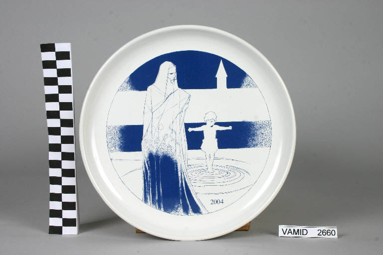 Piatto privo di tesa con largo cavetto. Sul fondo scena figurativa circolare in colore blu.