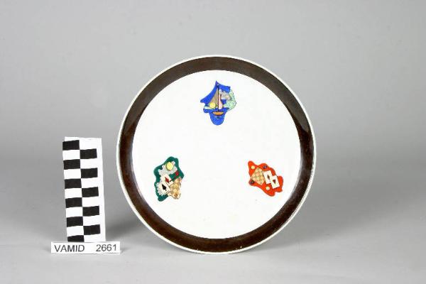 Piatto da frutta circolare privo di tesa; fondo bianco con tre specchiature mistilinee con soggetti decorativi su fondo colorato (rispettivamente una barca a vela, carte da gioco con gioco della dama, carte da gioco con gioco della dama e pipa) in posizione decentrata; fascia marrone sul bordo.
