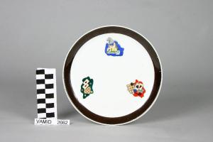 Piatto da frutta circolare privo di tesa; fondo bianco con tre specchiature mistilinee con soggetti decorativi su fondo colorato (rispettivamente la fabbrica delle ceramiche di Laveno, carte da gioco con gioco della dama, carte da gioco con gioco della dama e pipa) in posizione decentrata; fascia marrone sul bordo.