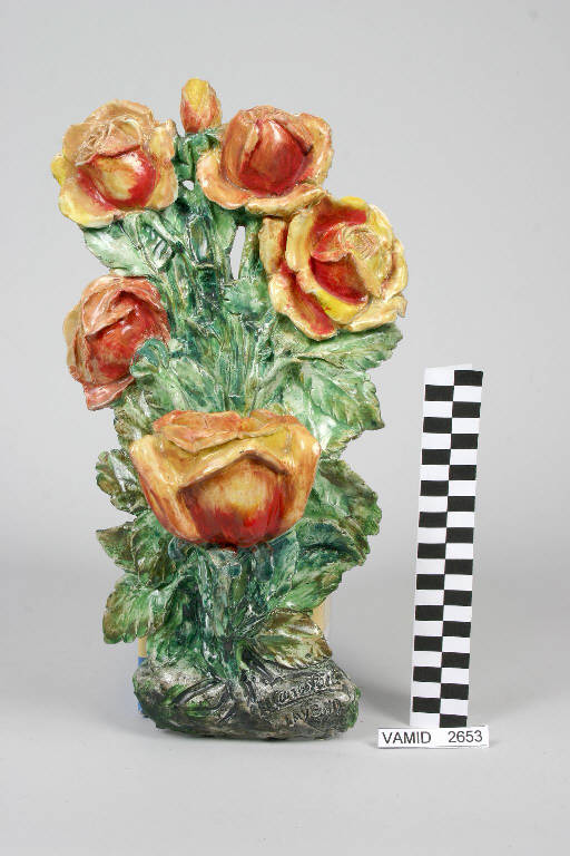 - NOTIZIE STORICO CRITICHE Lo scultore Casarotti, lavenese di adozione dal 1942, si applicò alla materia ceramica dopo essersi a lungo cimentato nella lavorazione del bronzo. La ceramica si rivelò un mezzo molto congeniale alla sua ricerca espressiva che indagava la natura con istintività e insieme accuratezza. Interessanti le creazioni del Casarotti tese a realizzare oggetti d'uso, come un vaso da fiori (cfr. inv. n. 2649) o una lampada da parete, sotto forma di scultura figurativa: e così nel nodo di un sacchetto di funghi improvvisato fatto con un fazzoletto si apre l'imboccatura di un vaso da fiori oppure nel bocciolo aperto di una rosa di un mazzo modellato ad altorilievo si ricava l'alloggiamento per la lampadina di un'applique. La datazione dell'opera è collocatbile negli anni '50, come altre sue opere fortemente naturalistiche.