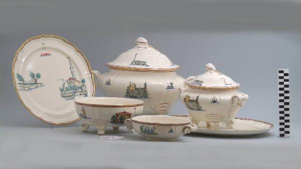 - NOTIZIE STORICO CRITICHE Il servizio da tavola in esame (num. inv. 2667... 2911) è accompagnato da un servizio da caffé (num. inv. 2672...2900). Fin dalla sua nomina a direttore artistico della SCI, Guido Andlovitz si prefisse di rigenerare le forme tradizionali con decori nuovi. E' il caso della forma ""Vecchio Milano"" cui adattò nel 1931 il nuovissimo decoro "Lago maggiore", come si evidenzia nel cospicuo servizio in esame a conferma che una decorazione nuova, se concepita organicamente, può conferire un aspetto attuale e "scattante" anche a una bella forma tradizionale. Fu certamente uno dei servizi più prestigiosi della produzione del momento se Andlovitz lo concepì in piccolissima serie e se l'azienda gli consentì - caso unico- di firmarlo nella marca. La scritta Verbano e la data 1931 presenti nel marchio suggeriscono che probabilmente il servizio fu realizzato per celebrare nel 1931 l'inizio della produzione di porcellana da tavola a Laveno nello stabilimento Verbano. Nell'ambito dei repertori decorativi creati dall'Andlovtz il decoro Lago Maggiore rappresenta un modo frazionato di raffigurare il paesaggio, definito da Mario Munari a "scena spezzata". L'impianto decorativo di queste ceramiche rifugge dalla centralità e dalla strutturazioni lungo diretrici ortogonali, mentre vi predominano l'asimmetria e le fughe visuali sghembe che risentono del gusto per la cineseria e il giapponismo. La semplificazione geometrica degli elementi e il modo di sfumare i corpi nel'intento di suggerirne la volumetria ricorda le opere di Carlo Carrà degli anni venti. Nel decoro Lago maggiore sono presenti espressioni diversificate di un tema molto caro a Guido Andlovitz: i "paesaggi d'acqua" con particolare ricorrenza delle 'barche' raffigurate in una vasta gamma di tipi, generalmente riprese da modelli reali e con divertenti variazioni fantastiche. Il decoro Lago fu applicato in un primo momento sulla forma "Vecchio Milano", poi sulla forma Pomezia (1936 ca.). Del decoro Lago esistono diversi disegni originali a matita, pastello, inchiostro e acquerello su carta conservati nel fondo archivistico della SCI: alcuni di questi raffigurano il decoro proprio sulla forma "Vecchio Milano" con le rifiniture che compaiono sui pezzi finiti. Nel Museo è conservato anche un altro servizio forma ""Vecchio Milano"" con decoro "Lago Maggiore", ma più ridotto nella quantità e nella varietà dei componenti e con filettatura monocroma (num. inv. 2051...3517). Negli anni '90 la Richard Ginori ha rimesso in produzione il servizio Lago.\nIl servizio in esame è eseguito a colaggio, mentre i decori sono realizzati a decalcomania (o transfer): si vedano in proposito le lastre in rame acciaiato conservate nel Museo e raffiguranti molti dei decori presenti nel servizio in combinazioni diversificate (nn. inv. 2480, 2483, 2484, 2485). Tipologicamente si lega ad un servizio da caffé (num. inv. 2672...2900).\nIl servizio è stato donato da Vanna Scotti Meregalli, nipote di Vanna Scotti, figlia dell'Ing. Luciano Scotti che fu direttore generale della SCI dal 1916.