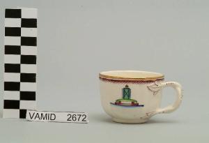 Tazza da caffé con corpo leggermente sagomato a coste rilevate, orlo ondulato e manico formato da due ramoscelli intrecciati che si innestano al corpo mediante foglioline a rilievo. Il fondo è bianco mentre i decori a smalti policromi sono costituiti da tre elementi caratteristici del Lago Maggiore. L'orlo è dorato e rifinito esternamente da una piccola fascia smaltata a tratteggio incrociato in rosso, il manico è evidenziato nelle due linee principali da una profilatura in rosso.