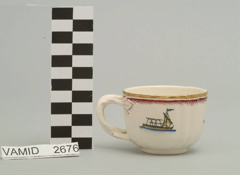 Tazza da caffé con corpo leggermente sagomato a coste rilevate, orlo ondulato e manico formato da due ramoscelli intrecciati che si innestano al corpo mediante foglioline a rilievo. Il fondo è bianco mentre i decori a smalti policromi sono costituiti da tre elementi caratteristici del Lago Maggiore. L'orlo è dorato e rifinito esternamente da una piccola fascia smaltata a tratteggio incrociato in rosso, il manico è evidenziato nelle due linee principali da una profilatura in rosso.