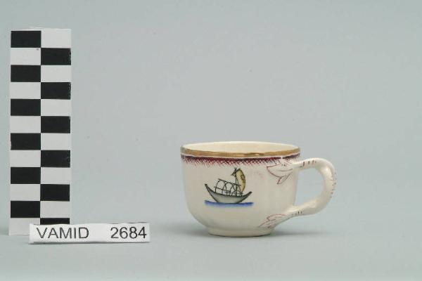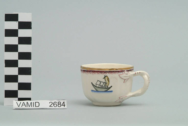 - NOTIZIE STORICO CRITICHE La tazzina da caffé in oggetto fa parte del servizio forma Vecchio Milano con decoro Lago Maggiore: vi sono raffigurati elementi caratteristici del Lago Maggiore (tre barche da pesca tipiche, dette burchielli, viste da diverse angolazioni) raffigurati con disegno stilizzato e fresco cromatismo, accentuato dall'uso dell'aerografo ideale per dare ombre e tridimensionalità anche a disegni di piccola dimensione, che conferiscono modernità e curiosità. Fin dalla sua nomina a direttore artistico della SCI, Guido Andlovitz si prefisse di rigenerare le forme tradizionali con decori nuovi. E' il caso della forma "Vecchio Milano" cui adattò nel 1931 il nuovissimo decoro "Lago maggiore", a conferma che una decorazione nuova, se concepita organicamente, può conferire un aspetto attuale e "scattante" anche a una bella forma tradizionale. Fu certamente uno dei servizi più prestigiosi della produzione del momento se Andlovitz lo concepì in piccolissima serie e se l'azienda gli consentì - caso unico- di firmarlo nella marca. La scritta Verbano e la data 1931 presenti nel marchio suggeriscono che probabilmente il servizio fu realizzato per celebrare nel 1931 l'inizio della produzione di porcellana da tavola a Laveno nello stabilimento Verbano. Nell'ambito dei repertori decorativi creati dall'Andlovtz il decoro Lago Maggiore rappresenta un modo frazionato di raffigurare il paesaggio, definito da Mario Munari a "scena spezzata". Nel servizio da caffè i decori sono costituiti da piccoli soggetti connotanti la vita e l''anima' stessa del lago: si tratta di una vasta gamma di minuti, singoli elementi (boe, barche, bandierine sventolanti, pesci, reti...), disegnati in modo semplificato e geometrico ma particolarmente vivace mediante il colore timbrico applicato all'aerografo. Nel decoro Lago maggiore sono presenti espressioni diversificate di un tema molto caro a Guido Andlovitz: i "paesaggi d'acqua" con particolare ricorrenza delle 'barche' raffigurate in una vasta gamma di tipi, generalmente riprese da modelli reali e con divertenti variazioni fantastiche. Il decoro Lago fu applicato in un primo momento sulla forma Vecchio Milano, poi sulla forma Pomezia (1936 ca.). Del decoro Lago esistono diversi disegni originali a matita, pastello, inchiostro e acquerello su carta conservati nel fondo archivistico della SCI: alcuni di questi raffigurano il decoro proprio sulla forma Vecchio Milano con le rifiniture che compaiono sui pezzi finiti. La versione con il manico biforcato, cioè intrecciato come quello nelle tazzine del servizio, venne pubblicata per la prima volta nel catalogo del 1935. Nel Museo è conservato anche un altro servizio forma "Vecchio Milano" con decoro "Lago Maggiore", ma più ridotto nella quantità e nella varietà dei componenti e con filettatura monocroma (num. inv. 2051...3517). Negli anni '90 la Richard Ginori ha rimesso in produzione il servizio Lago.\nIl servizio in esame è eseguito a colaggio, mentre i decori sono realizzati a decalcomania (o transfer): si vedano in proposito le lastre in rame acciaiato conservate nel Museo e raffiguranti molti dei decori presenti nel servizio in combinazioni diversificate (nn. inv. 2480, 2483, 2484, 2485). Tipologicamente si lega ad un servizio da tavola (num. inv. 2667...2911).\nIl servizio è stato donato da Vanna Scotti Meregalli, nipote di Vanna Scotti, figlia dell'Ing. Luciano Scotti che fu direttore generale della SCI dal 1916.