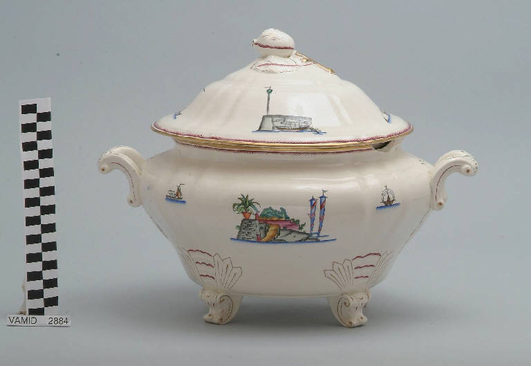 Zuppiera formata da un contenitore a forma ovale con corpo sagomato e panciuto e l'orlo estroflesso e ondulato. Il recipiente poggia su quattro piedini a voluta a "C" ed è fornito di due manici, anch'essi a "C", applicati sui lati brevi. Il coperchio presenta una bombatura pronunciata e un frutto modellato a tutto tondo come presa apicale. Il fondo è bianco mentre i decori a smalti policromi sono distribuiti sulle due facce principali del recipiente e sulla superficie esterna del coperchio. Gli orli sono dorati e rifiniti esternamente da una piccola fascia smaltata a tratteggio incrociato in rosso; anche i piedini, i loro attacchi a rilievo a forma di foglie e i manici sono rifiniti con filettature in rosso e in oro.