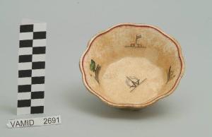 Coppetta circolare a profilo sagomato ondulato con alto bordo terminante con orlo ondulato. Il fondo è bianco mentre i decori a smalti policromi sono distribuiti sul fondo e internamente al bordo. L'orlo è dorato e rifinito da una piccola fascia smaltata a tratteggio incrociato in rosso.