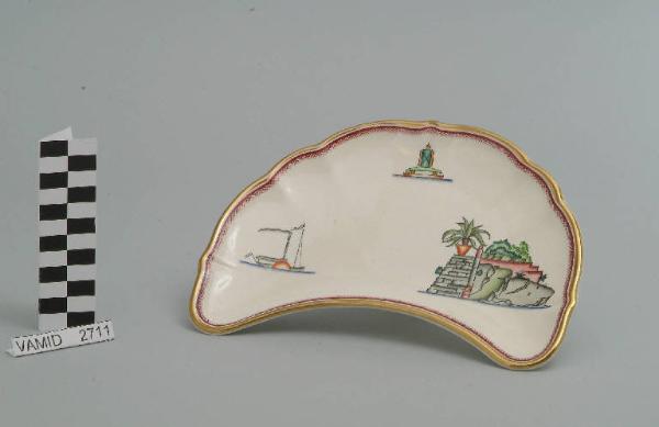 Piatto lunetta con fondo leggeremente concavo e l'orlo ondulato. Il fondo è bianco mentre i decori sono a smalti policromi e sono collocati ai due lati della falce di luna e al centro in alto. L'orlo è dorato e rifinito da una piccola fascia smaltata a tratteggio incrociato in rosso.