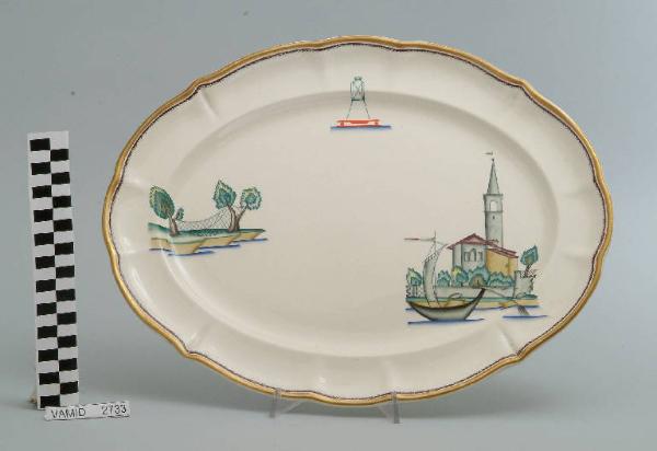 - NOTIZIE STORICO CRITICHE Il piatto da portata ovale in esame fa parte del servizio forma "Vecchio Milano" con decoro "Lago Maggiore": vi sono raffigurati uno scorcio del Lago Maggiore (una chiesa vicina alla riva del lago da identificarsi probabilmente con quella di Laveno-Mombello o quella dell'Isola dei Pescatori) ed elementi caratteristici della vita sul lago (le reti da pesca stese ad asciugare alle fronde degli alberi sulla riva del lago e una boa luminosa) rappresentati in un'atmosfera sospesa e silenziosa, seppur ridente nella resa stilizzata e nel fresco cromatismo delle raffigurazioni. Fin dalla sua nomina a direttore artistico della "S.C.I.", Guido Andlovitz si prefisse di rigenerare le forme tradizionali con decori nuovi. E' il caso della forma "Vecchio Milano" cui adattò nel 1931 il nuovissimo decoro "Lago Maggiore", a conferma che una decorazione nuova, se concepita organicamente, può conferire un aspetto attuale e "scattante" anche a una bella forma tradizionale. Fu certamente uno dei servizi più prestigiosi della produzione del momento se Andlovitz lo concepì in piccolissima serie e se l'azienda gli consentì - caso unico- di firmarlo nella marca. La scritta Verbano e la data 1931 presenti nel marchio suggeriscono che probabilmente il servizio fu realizzato per celebrare nel 1931 l'inizio della produzione di porcellana da tavola a Laveno nello stabilimento Verbano. Nell'ambito dei repertori decorativi creati dall'Andlovtz il decoro "Lago Maggiore" rappresenta un modo frazionato di raffigurare il paesaggio, definito da Mario Munari a "scena spezzata". L'impianto decorativo di queste ceramiche rifugge dalla centralità e dalla strutturazioni lungo diretrici ortogonali, mentre vi predominano l'asimmetria e le fughe visuali sghembe che risentono del gusto per la cineseria e il giapponismo. La semplificazione geometrica degli elementi e il modo di sfumare i corpi nel'intento di suggerirne la volumetria ricorda le opere di Carlo Carrà degli anni venti. Nel decoro "Lago Maggiore" sono presenti espressioni diversificate di un tema molto caro a Guido Andlovitz: i "paesaggi d'acqua" con particolare ricorrenza delle 'barche' raffigurate in una vasta gamma di tipi, generalmente riprese da modelli reali e con divertenti variazioni fantastiche. Il decoro Lago fu applicato in un primo momento sulla forma "Vecchio Milano", poi sulla forma "Pomezia" (1936 ca.). Del decoro Lago esistono diversi disegni originali a matita, pastello, inchiostro e acquerello su carta conservati nel fondo archivistico della "S.C.I.": alcuni di questi raffigurano il decoro proprio sulla forma "Vecchio Milano" con le rifiniture che compaiono sui pezzi finiti. Nel Museo è conservato anche un altro servizio forma "Vecchio Milano" con decoro "Lago Maggiore", ma più ridotto nella quantità e nella varietà dei componenti e con filettatura monocroma (num. inv. 2051...3517). Negli anni '90 la Richard Ginori ha rimesso in produzione il servizio Lago.\nIl servizio in esame è eseguito a colaggio, mentre i decori sono realizzati a decalcomania (o transfer): si vedano in proposito le lastre in rame acciaiato conservate nel Museo e raffiguranti molti dei decori presenti nel servizio in combinazioni diversificate (nn. inv. 2480, 2483, 2484, 2485). Tipologicamente si lega ad un servizio da caffé (num. inv. 2672...2900).\nIl piatto da portata è stato donato da Vanna Scotti Meregalli, nipote di Vanna Scotti, figlia dell'Ing. Luciano Scotti che fu direttore generale della "S.C.I." dal 1916.