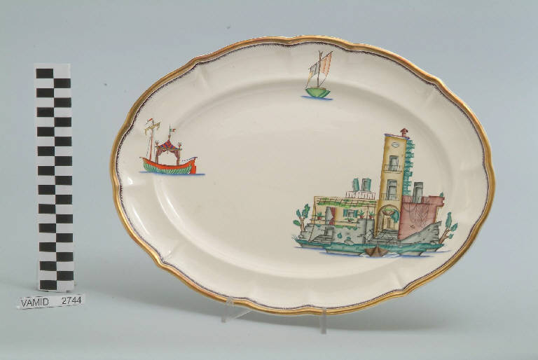 - NOTIZIE STORICO CRITICHE Il piatto da portata ovale in esame fa parte del servizio forma "Vecchio Milano" con decoro "Lago Maggiore": vi sono raffigurati uno scorcio del Lago Maggiore (case di pescatori sulla riva del lago, la raffigurazione risulta capovolta rispetto alla scena presente sui piatti inv. nn. 2725, 2888) ed elementi caratteristici della vita sul lago (una barca a vela da parata e una barca da pesca) rappresentati in un'atmosfera sospesa e silenziosa, seppur ridente nella resa stilizzata e nel fresco cromatismo delle raffigurazioni. Fin dalla sua nomina a direttore artistico della "S.C.I.", Guido Andlovitz si prefisse di rigenerare le forme tradizionali con decori nuovi. E' il caso della forma "Vecchio Milano" cui adattò nel 1931 il nuovissimo decoro "Lago Maggiore", a conferma che una decorazione nuova, se concepita organicamente, può conferire un aspetto attuale e "scattante" anche a una bella forma tradizionale. Fu certamente uno dei servizi più prestigiosi della produzione del momento se Andlovitz lo concepì in piccolissima serie e se l'azienda gli consentì - caso unico- di firmarlo nella marca. La scritta Verbano e la data 1931 presenti nel marchio suggeriscono che probabilmente il servizio fu realizzato per celebrare nel 1931 l'inizio della produzione di porcellana da tavola a Laveno nello stabilimento Verbano. Nell'ambito dei repertori decorativi creati dall'Andlovtz il decoro "Lago Maggiore" rappresenta un modo frazionato di raffigurare il paesaggio, definito da Mario Munari a "scena spezzata". L'impianto decorativo di queste ceramiche rifugge dalla centralità e dalla strutturazioni lungo diretrici ortogonali, mentre vi predominano l'asimmetria e le fughe visuali sghembe che risentono del gusto per la cineseria e il giapponismo. La semplificazione geometrica degli elementi e il modo di sfumare i corpi nel'intento di suggerirne la volumetria ricorda le opere di Carlo Carrà degli anni venti. Nel decoro "Lago Maggiore" sono presenti espressioni diversificate di un tema molto caro a Guido Andlovitz: i "paesaggi d'acqua" con particolare ricorrenza delle 'barche' raffigurate in una vasta gamma di tipi, generalmente riprese da modelli reali e con divertenti variazioni fantastiche. Il decoro Lago fu applicato in un primo momento sulla forma "Vecchio Milano", poi sulla forma "Pomezia" (1936 ca.). Del decoro Lago esistono diversi disegni originali a matita, pastello, inchiostro e acquerello su carta conservati nel fondo archivistico della "S.C.I.": alcuni di questi raffigurano il decoro proprio sulla forma "Vecchio Milano" con le rifiniture che compaiono sui pezzi finiti. Nel Museo è conservato anche un altro servizio forma "Vecchio Milano" con decoro "Lago Maggiore", ma più ridotto nella quantità e nella varietà dei componenti e con filettatura monocroma (num. inv. 2051...3517). Negli anni '90 la Richard Ginori ha rimesso in produzione il servizio Lago.\nIl servizio in esame è eseguito a colaggio, mentre i decori sono realizzati a decalcomania (o transfer): si vedano in proposito le lastre in rame acciaiato conservate nel Museo e raffiguranti molti dei decori presenti nel servizio in combinazioni diversificate (nn. inv. 2480, 2483, 2484, 2485). Tipologicamente si lega ad un servizio da caffé (num. inv. 2672...2900).\nIl piatto da portata è stato donato da Vanna Scotti Meregalli, nipote di Vanna Scotti, figlia dell'Ing. Luciano Scotti che fu direttore generale della "S.C.I." dal 1916.