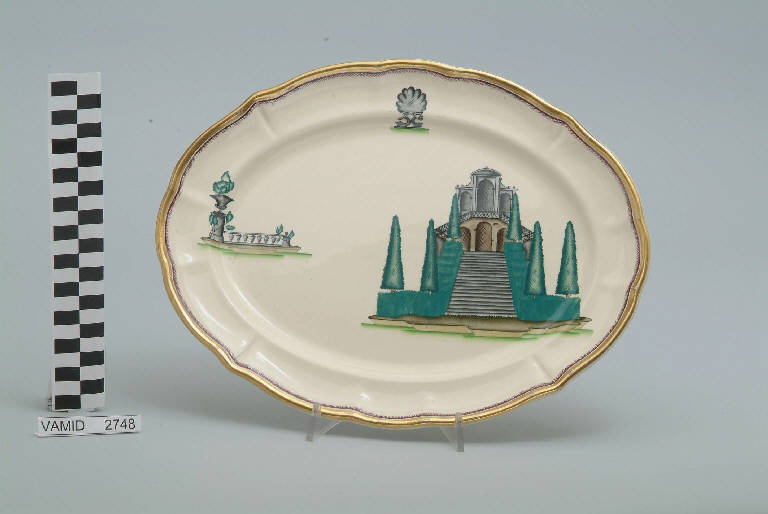 - NOTIZIE STORICO CRITICHE Il piatto da portata ovale in esame fa parte del servizio forma "Vecchio Milano" con decoro "Lago Maggiore": vi sono raffigurati scorci minori (un giardino all'italiana con esedra sullo sfondo che ricorda giardini come quello della Villa Bozzolo a Casalzuigno o quello degli Estensi a Varese, una balaustrata con vaso, sempre ripresa da similari giardini) e un elemento portato a simbolo dell''anima' del Lago maggiore (un elemento scultoreo con valva di conchiglia sostenuta da due delfini, presente in similari accezioni nell'arredo di alcuni giardini antichi della zona), rappresentati in un'atmosfera sospesa e silenziosa, seppur ridente nella resa stilizzata e nel fresco cromatismo delle raffigurazioni. Fin dalla sua nomina a direttore artistico della "S.C.I.", Guido Andlovitz si prefisse di rigenerare le forme tradizionali con decori nuovi. E' il caso della forma "Vecchio Milano" cui adattò nel 1931 il nuovissimo decoro "Lago Maggiore", a conferma che una decorazione nuova, se concepita organicamente, può conferire un aspetto attuale e "scattante" anche a una bella forma tradizionale. Fu certamente uno dei servizi più prestigiosi della produzione del momento se Andlovitz lo concepì in piccolissima serie e se l'azienda gli consentì - caso unico- di firmarlo nella marca. La scritta Verbano e la data 1931 presenti nel marchio suggeriscono che probabilmente il servizio fu realizzato per celebrare nel 1931 l'inizio della produzione di porcellana da tavola a Laveno nello stabilimento Verbano. Nell'ambito dei repertori decorativi creati dall'Andlovtz il decoro "Lago Maggiore" rappresenta un modo frazionato di raffigurare il paesaggio, definito da Mario Munari a "scena spezzata". L'impianto decorativo di queste ceramiche rifugge dalla centralità e dalla strutturazioni lungo diretrici ortogonali, mentre vi predominano l'asimmetria e le fughe visuali sghembe che risentono del gusto per la cineseria e il giapponismo. La semplificazione geometrica degli elementi e il modo di sfumare i corpi nel'intento di suggerirne la volumetria ricorda le opere di Carlo Carrà degli anni venti. Nel decoro "Lago Maggiore" sono presenti espressioni diversificate di un tema molto caro a Guido Andlovitz: i "paesaggi d'acqua" con particolare ricorrenza delle 'barche' raffigurate in una vasta gamma di tipi, generalmente riprese da modelli reali e con divertenti variazioni fantastiche. Il decoro Lago fu applicato in un primo momento sulla forma "Vecchio Milano", poi sulla forma "Pomezia" (1936 ca.). Del decoro Lago esistono diversi disegni originali a matita, pastello, inchiostro e acquerello su carta conservati nel fondo archivistico della "S.C.I.": alcuni di questi raffigurano il decoro proprio sulla forma "Vecchio Milano" con le rifiniture che compaiono sui pezzi finiti. Nel Museo è conservato anche un altro servizio forma "Vecchio Milano" con decoro "Lago Maggiore", ma più ridotto nella quantità e nella varietà dei componenti e con filettatura monocroma (num. inv. 2051...3517). Negli anni '90 la Richard Ginori ha rimesso in produzione il servizio Lago.\nIl servizio in esame è eseguito a colaggio, mentre i decori sono realizzati a decalcomania (o transfer): si vedano in proposito le lastre in rame acciaiato conservate nel Museo e raffiguranti molti dei decori presenti nel servizio in combinazioni diversificate (nn. inv. 2480, 2483, 2484, 2485). Tipologicamente si lega ad un servizio da caffé (num. inv. 2672...2900).\nIl piatto da portata è stato donato da Vanna Scotti Meregalli, nipote di Vanna Scotti, figlia dell'Ing. Luciano Scotti che fu direttore generale della "S.C.I." dal 1916.