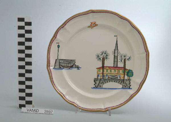 - NOTIZIE STORICO CRITICHE Il piatto piano in esame fa parte del servizio forma "Vecchio Milano" con decoro "Lago Maggiore": vi sono raffigurati una veduta del lungolago di Laveno-Mombello con il Municipio, e alcuni elementi caratteristici della vita sul lago (un porticciolo con una barca da pesca tipica, detta burchiello, all'ancora e un vaso sopra un disegno progettuale in riferimento all'attività di Andlovitz come direttore artistico della S. C. I.), rappresentati in un'atmosfera sospesa e silenziosa, seppur ridente nella resa stilizzata e nel fresco cromatismo delle raffigurazioni. Fin dalla sua nomina a direttore artistico della "S.C.I.", Guido Andlovitz si prefisse di rigenerare le forme tradizionali con decori nuovi. E' il caso della forma "Vecchio Milano" cui adattò nel 1931 il nuovissimo decoro "Lago Maggiore", a conferma che una decorazione nuova, se concepita organicamente, può conferire un aspetto attuale e "scattante" anche a una bella forma tradizionale. Fu certamente uno dei servizi più prestigiosi della produzione del momento se Andlovitz lo concepì in piccolissima serie e se l'azienda gli consentì - caso unico- di firmarlo nella marca. La scritta Verbano e la data 1931 presenti nel marchio suggeriscono che probabilmente il servizio fu realizzato per celebrare nel 1931 l'inizio della produzione di porcellana da tavola a Laveno nello stabilimento Verbano. Nell'ambito dei repertori decorativi creati dall'Andlovtz il decoro "Lago Maggiore" rappresenta un modo frazionato di raffigurare il paesaggio, definito da Mario Munari a "scena spezzata". L'impianto decorativo di queste ceramiche rifugge dalla centralità e dalla strutturazioni lungo diretrici ortogonali, mentre vi predominano l'asimmetria e le fughe visuali sghembe che risentono del gusto per la cineseria e il giapponismo. La semplificazione geometrica degli elementi e il modo di sfumare i corpi nel'intento di suggerirne la volumetria ricorda le opere di Carlo Carrà degli anni venti. Nel decoro "Lago Maggiore" sono presenti espressioni diversificate di un tema molto caro a Guido Andlovitz: i "paesaggi d'acqua" con particolare ricorrenza delle 'barche' raffigurate in una vasta gamma di tipi, generalmente riprese da modelli reali e con divertenti variazioni fantastiche. Il decoro Lago fu applicato in un primo momento sulla forma "Vecchio Milano", poi sulla forma "Pomezia" (1936 ca.). Del decoro Lago esistono diversi disegni originali a matita, pastello, inchiostro e acquerello su carta conservati nel fondo archivistico della "S.C.I.": alcuni di questi raffigurano il decoro proprio sulla forma "Vecchio Milano" con le rifiniture che compaiono sui pezzi finiti. Nel Museo è conservato anche un altro servizio forma "Vecchio Milano" con decoro "Lago Maggiore", ma più ridotto nella quantità e nella varietà dei componenti e con filettatura monocroma (num. inv. 2051...3517). Negli anni '90 la Richard Ginori ha rimesso in produzione il servizio Lago.\nIl servizio in esame è eseguito a colaggio, mentre i decori sono realizzati a decalcomania (o transfer): si vedano in proposito le lastre in rame acciaiato conservate nel Museo e raffiguranti molti dei decori presenti nel servizio in combinazioni diversificate (nn. inv. 2480, 2483, 2484, 2485). Tipologicamente si lega ad un servizio da caffé (num. inv. 2672...2900).\nIl piatto piano è stato donato da Vanna Scotti Meregalli, nipote di Vanna Scotti, figlia dell'Ing. Luciano Scotti che fu direttore generale della "S.C.I." dal 1916.