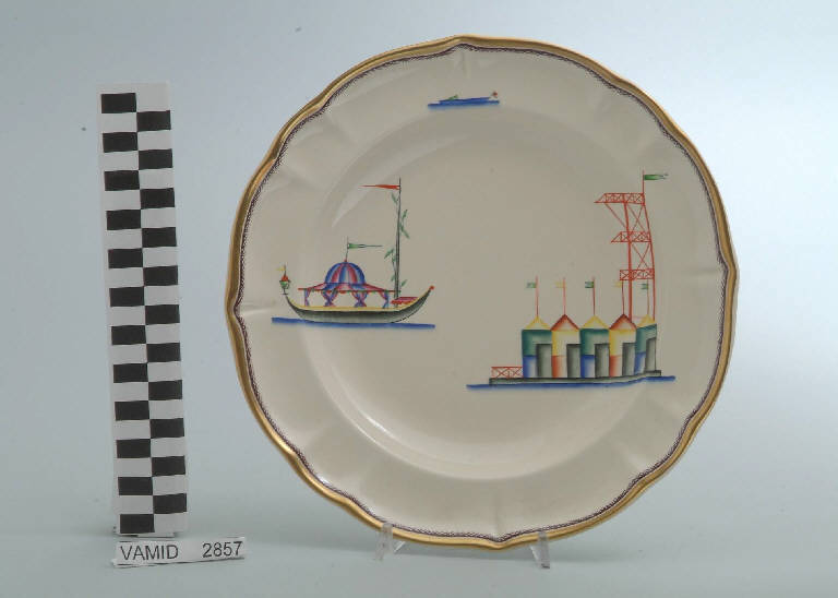 - NOTIZIE STORICO CRITICHE Il piatto fondo in esame fa parte del servizio forma "Vecchio Milano" con decoro "Lago Maggiore": vi sono raffigurati una veduta di uno stabilimento balneare con cabine colorate e un trampolino, e alcuni elementi caratteristici della vita sul lago (una gondola da parata con tendaggio a strisce e lanterna, e un motoscafo), rappresentati in un'atmosfera sospesa e silenziosa, seppur ridente nella resa stilizzata e nel fresco cromatismo delle raffigurazioni. Fin dalla sua nomina a direttore artistico della "S.C.I.", Guido Andlovitz si prefisse di rigenerare le forme tradizionali con decori nuovi. E' il caso della forma "Vecchio Milano" cui adattò nel 1931 il nuovissimo decoro "Lago Maggiore", a conferma che una decorazione nuova, se concepita organicamente, può conferire un aspetto attuale e "scattante" anche a una bella forma tradizionale. Fu certamente uno dei servizi più prestigiosi della produzione del momento se Andlovitz lo concepì in piccolissima serie e se l'azienda gli consentì - caso unico- di firmarlo nella marca. La scritta Verbano e la data 1931 presenti nel marchio suggeriscono che probabilmente il servizio fu realizzato per celebrare nel 1931 l'inizio della produzione di porcellana da tavola a Laveno nello stabilimento Verbano. Nell'ambito dei repertori decorativi creati dall'Andlovtz il decoro "Lago Maggiore" rappresenta un modo frazionato di raffigurare il paesaggio, definito da Mario Munari a "scena spezzata". L'impianto decorativo di queste ceramiche rifugge dalla centralità e dalla strutturazioni lungo diretrici ortogonali, mentre vi predominano l'asimmetria e le fughe visuali sghembe che risentono del gusto per la cineseria e il giapponismo. La semplificazione geometrica degli elementi e il modo di sfumare i corpi nel'intento di suggerirne la volumetria ricorda le opere di Carlo Carrà degli anni venti. Nel decoro "Lago Maggiore" sono presenti espressioni diversificate di un tema molto caro a Guido Andlovitz: i "paesaggi d'acqua" con particolare ricorrenza delle 'barche' raffigurate in una vasta gamma di tipi, generalmente riprese da modelli reali e con divertenti variazioni fantastiche. Il decoro Lago fu applicato in un primo momento sulla forma "Vecchio Milano", poi sulla forma "Pomezia" (1936 ca.). Del decoro Lago esistono diversi disegni originali a matita, pastello, inchiostro e acquerello su carta conservati nel fondo archivistico della "S.C.I.": alcuni di questi raffigurano il decoro proprio sulla forma "Vecchio Milano" con le rifiniture che compaiono sui pezzi finiti. Nel Museo è conservato anche un altro servizio forma "Vecchio Milano" con decoro "Lago Maggiore", ma più ridotto nella quantità e nella varietà dei componenti e con filettatura monocroma (num. inv. 2051...3517). Negli anni '90 la Richard Ginori ha rimesso in produzione il servizio Lago.\nIl servizio in esame è eseguito a colaggio, mentre i decori sono realizzati a decalcomania (o transfer): si vedano in proposito le lastre in rame acciaiato conservate nel Museo e raffiguranti molti dei decori presenti nel servizio in combinazioni diversificate (nn. inv. 2480, 2483, 2484, 2485). Tipologicamente si lega ad un servizio da caffé (num. inv. 2672...2900).\nIl piatto fondo è stato donato da Vanna Scotti Meregalli, nipote di Vanna Scotti, figlia dell'Ing. Luciano Scotti che fu direttore generale della "S.C.I." dal 1916.