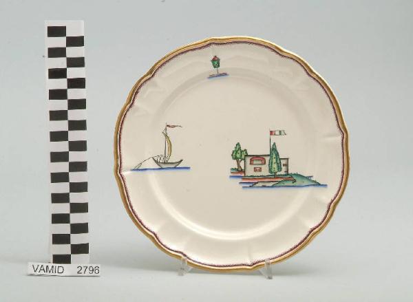 - NOTIZIE STORICO CRITICHE Il piatto da frutta in esame fa parte del servizio forma "Vecchio Milano" con decoro "Lago Maggiore": vi sono raffigurati uno scorcio (un fortino con bandiera italiana sulla riva del lago) ed elementi caratteristici della vita sul lago (una boa luminosa e una barca da pesca tipica, detta burchiello, in navigazione) rappresentati in un'atmosfera sospesa e silenziosa, seppur ridente nella resa stilizzata e nel fresco cromatismo delle raffigurazioni. Fin dalla sua nomina a direttore artistico della "S.C.I.", Guido Andlovitz si prefisse di rigenerare le forme tradizionali con decori nuovi. E' il caso della forma "Vecchio Milano" cui adattò nel 1931 il nuovissimo decoro "Lago Maggiore", a conferma che una decorazione nuova, se concepita organicamente, può conferire un aspetto attuale e "scattante" anche a una bella forma tradizionale. Fu certamente uno dei servizi più prestigiosi della produzione del momento se Andlovitz lo concepì in piccolissima serie e se l'azienda gli consentì - caso unico- di firmarlo nella marca. La scritta Verbano e la data 1931 presenti nel marchio suggeriscono che probabilmente il servizio fu realizzato per celebrare nel 1931 l'inizio della produzione di porcellana da tavola a Laveno nello stabilimento Verbano. Nell'ambito dei repertori decorativi creati dall'Andlovtz il decoro "Lago Maggiore" rappresenta un modo frazionato di raffigurare il paesaggio, definito da Mario Munari a "scena spezzata". L'impianto decorativo di queste ceramiche rifugge dalla centralità e dalla strutturazioni lungo diretrici ortogonali, mentre vi predominano l'asimmetria e le fughe visuali sghembe che risentono del gusto per la cineseria e il giapponismo. La semplificazione geometrica degli elementi e il modo di sfumare i corpi nel'intento di suggerirne la volumetria ricorda le opere di Carlo Carrà degli anni venti. Nel decoro "Lago Maggiore" sono presenti espressioni diversificate di un tema molto caro a Guido Andlovitz: i "paesaggi d'acqua" con particolare ricorrenza delle 'barche' raffigurate in una vasta gamma di tipi, generalmente riprese da modelli reali e con divertenti variazioni fantastiche. Il decoro Lago fu applicato in un primo momento sulla forma "Vecchio Milano", poi sulla forma "Pomezia" (1936 ca.). Del decoro Lago esistono diversi disegni originali a matita, pastello, inchiostro e acquerello su carta conservati nel fondo archivistico della "S.C.I.": alcuni di questi raffigurano il decoro proprio sulla forma "Vecchio Milano" con le rifiniture che compaiono sui pezzi finiti. Nel Museo è conservato anche un altro servizio forma "Vecchio Milano" con decoro "Lago Maggiore", ma più ridotto nella quantità e nella varietà dei componenti e con filettatura monocroma (num. inv. 2051...3517). Negli anni '90 la Richard Ginori ha rimesso in produzione il servizio Lago.\nIl servizio in esame è eseguito a colaggio, mentre i decori sono realizzati a decalcomania (o transfer): si vedano in proposito le lastre in rame acciaiato conservate nel Museo e raffiguranti molti dei decori presenti nel servizio in combinazioni diversificate (nn. inv. 2480, 2483, 2484, 2485). Tipologicamente si lega ad un servizio da caffé (num. inv. 2672...2900).\nIl piatto da frutta è stato donato da Vanna Scotti Meregalli, nipote di Vanna Scotti, figlia dell'Ing. Luciano Scotti che fu direttore generale della "S.C.I." dal 1916.