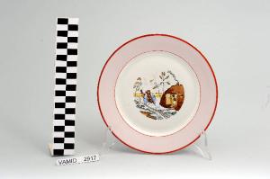 - NOTIZIE STORICO CRITICHE Il piatto piano, che si accompagna ad altri tre elementi (nn. inv. 2915, 2922, 2923), fu realizzato in porcellana bianca smaltata con filettature rosse sulla tesa a delimitazione di una fascia di colore rosa e da una vignetta a decalcomania sopravernice illustrante la fiaba della cicala e della formica di Esopo, adattata anche da Jean de la Fontaine. Nel disegno, stilizzato e molto colorato per attirare l'attenzione dei bambini, vi sono delle strette affinità con le tipologie disegnative presenti nei contemporanei fumetti e cartoni animati per l'infanzia. Lo stabilimento Verbano di Laveno, costruito nel 1924 per la fabbricazione di isolatori in porcellana sulla base di un'intesa con la Porzellanfabrik Rosenthal di Selb (Baviera), iniziò la produzione di porcellana da tavola nel 1931: tale produzione cessò nel 1966.