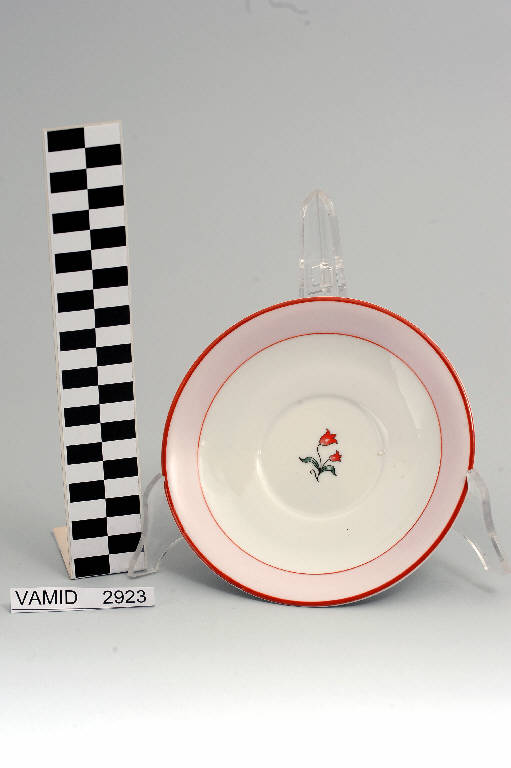 Il piattino di colore bianco, a corredo della tazza da colazione, è decorato sulla tesa da una fascia di colore rosa delimitata da filettature rosse e, sul fondo, da un piccolo fiore a decalcomania sopravernice.