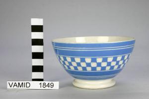 Ciotola da colazione decorata con motivo geometrico su sfondo in smalto azzurro a rilievo. Incisa a scacchi e fili bianchi.