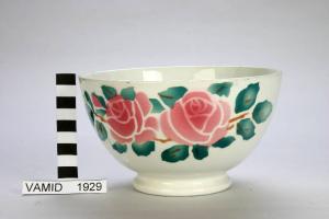 Ciotola da colazione con decorazione floreale sulla parte frontale. Le rose sono eseguite in porpora e le foglie in verde su fondo bianco.
