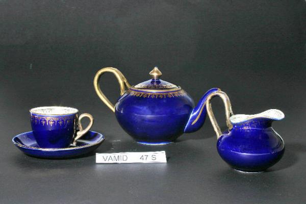 Servizio da thè, del genere "a guarnitura", composto da una tazza con piattino, teiera con coperchio e lattiera.