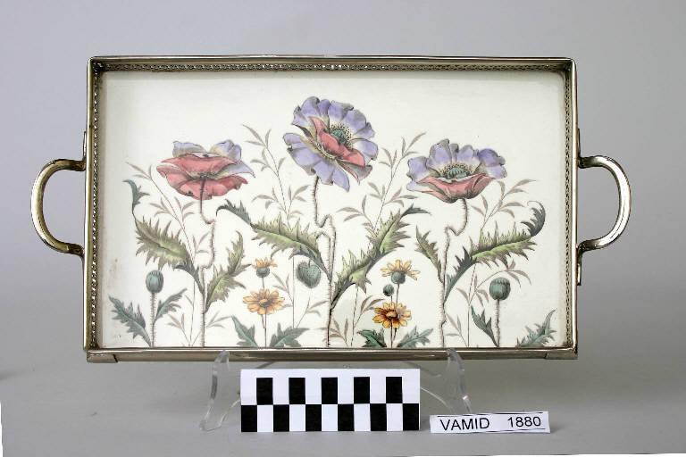 Piccolo vassoio con montature in metallo, decorato con papaveri su fondo bianco.