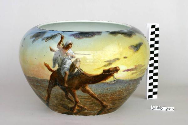Vaso decorato con una figura maschile a dorso di cammello in un paesaggio desertico.