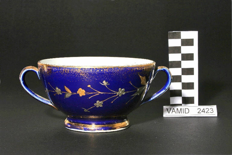 Zuccheriera decorata a motivi floreali a rilievo in oro e argento su fondo blu cobalto. Rifiniture in oro brillante su manici, impugnatura, coperchio, bordi.