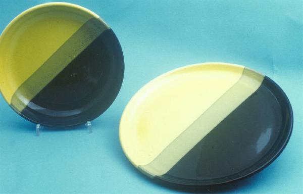 Servizio da tavola composto da due elementi: un piatto fondo e un piatto piano nei colori giallo, verde e nero decorati con striscia obliqua.