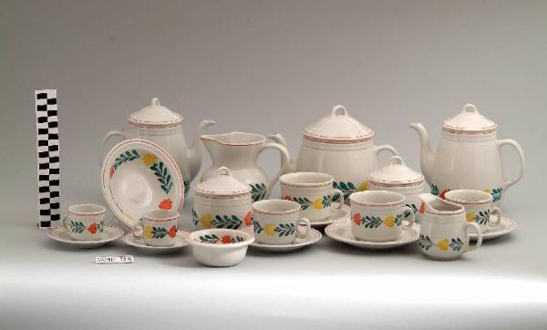 Il servizio da caffè è composto da sei elementi: due caffettiere, una lattiera, una zuccheriera e due tazze da caffè di colore bianco con motivo decorativo vegetale in verde, giallo e arancio.