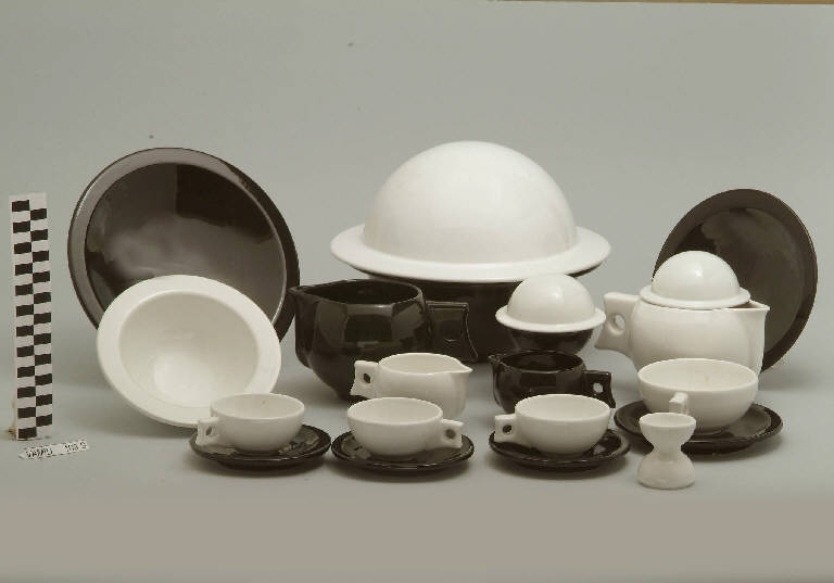 - NOTIZIE STORICO CRITICHE Il servizio da caffè, composto da sei elementi (nn. inv. 784, 786, 800-803), è realizzato nella forma "Saturno". Il design essenziale e funzionale indica una datazione ormai avanzata nel Novecentro. Come riporta il cartellino applicato alla zuppiera num. inv. 793, l'oggetto in esame venne realizzato nel 1970 dalle Ceramiche Pareschi in collaborazione con Albino Reggiori. L'artista lavenese cominciò a fare ceramica nel 1955 ma fu dopo il 1981 che la sua ricerca si sviluppò prevalentemente nel campo ceramistico, in modo particolare sui materiali ceramici legati alla propria terra. Tipologicamente il servizio in esame si lega ad un servizio da thè (nn. inv. 785...804) e ad un servizio da tavola (nn. inv. 789-796) conservati nel Museo delle Terraglie di Laveno.