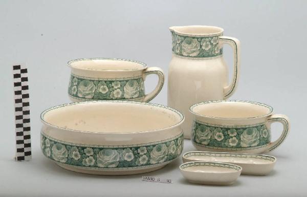 Il servizio igienico da camera è composto da sei elementi: una brocca, due pitali, due portasaponi e un catino lavamano di colore bianco con motivo floreale (primule e rose) e motivo decorativo geometrico in verde.