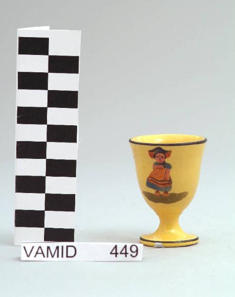 Portauovo con piede circolare; fondo giallo decorato con paesaggio olandese in rosa, arancio, marrone, azzurro e verde; bordo rifinito con filettatura nera.