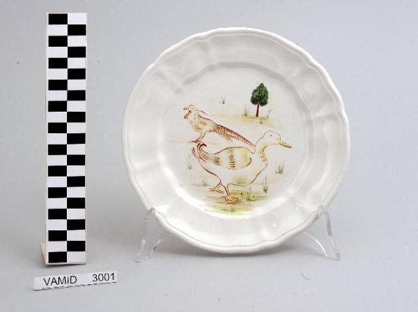 Piatto piano circolare con tesa ondulata e bordo leggermente arcuato e modellato con una profilatura incisa; fondo color bianco avorio con animali policromi nel cavetto.