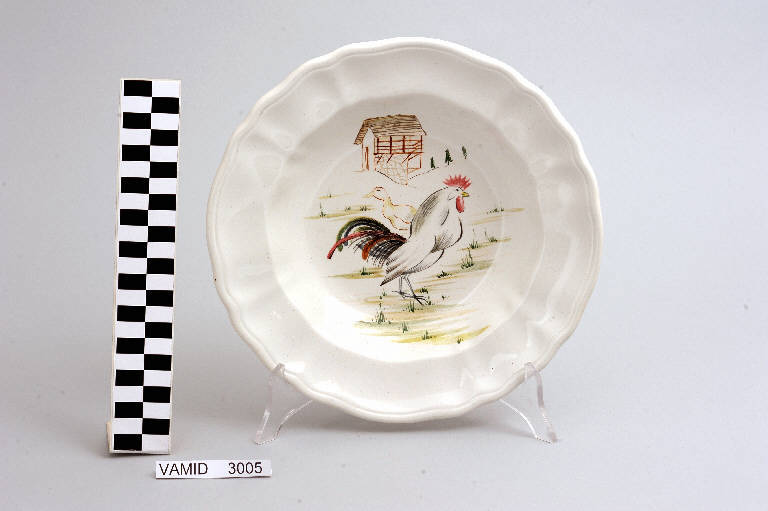 Piatto fondo circolare con tesa ondulata e bordo leggermente arcuato e modellato con una profilatura incisa; fondo color bianco avorio con animali policromi nel cavetto.