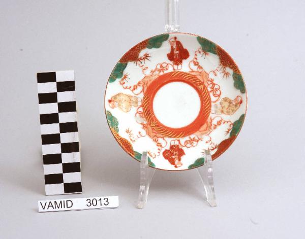 • NOTIZIE STORICO CRITICHE Il piattino, appartenente ad un servizio da thè composto da ventuno elementi (nn. inv. 3012-3032), è decorato sottosmalto nei colori verde, rosso, ocra e pesca e rifinita soprasmalto con filettatura rossa. Il marchio non identificato presente su alcuni pezzi del servizio permette comunque di escludere una manifattura lavenese. L'influenza dell'arte giapponese in Occidente cominciò a farsi sentire dalla seconda metà dell'Ottocento e durò sino ai primi decenni del Novecento. La forma semplice e globulare del manufatto, indicante ormai una piena assimilazione del funzionalismo, e la tipologia del decoro suggeriscono una datazione tra gli anni '30 e '40 del Novecento. Il piattino fa parte di una donazione di privati al Museo.